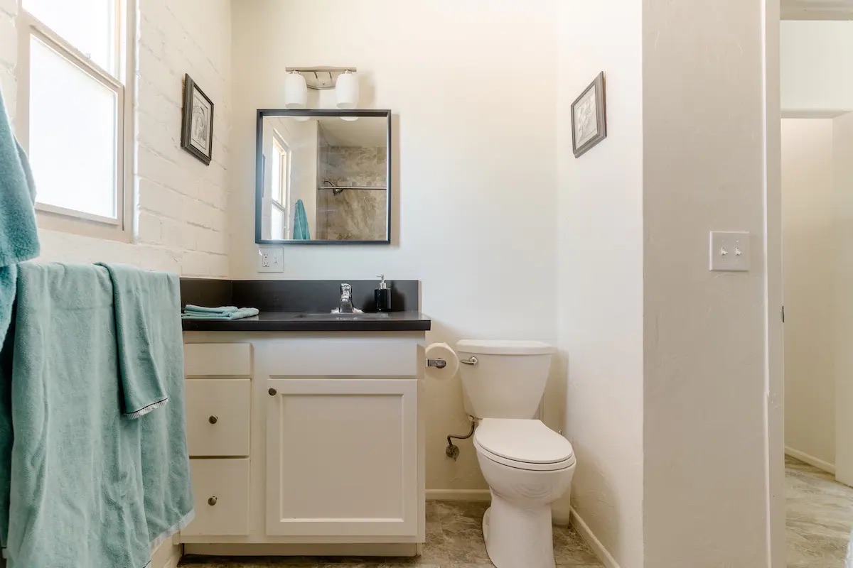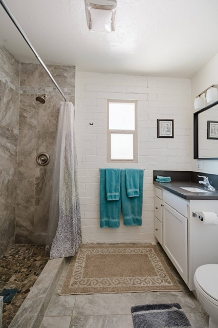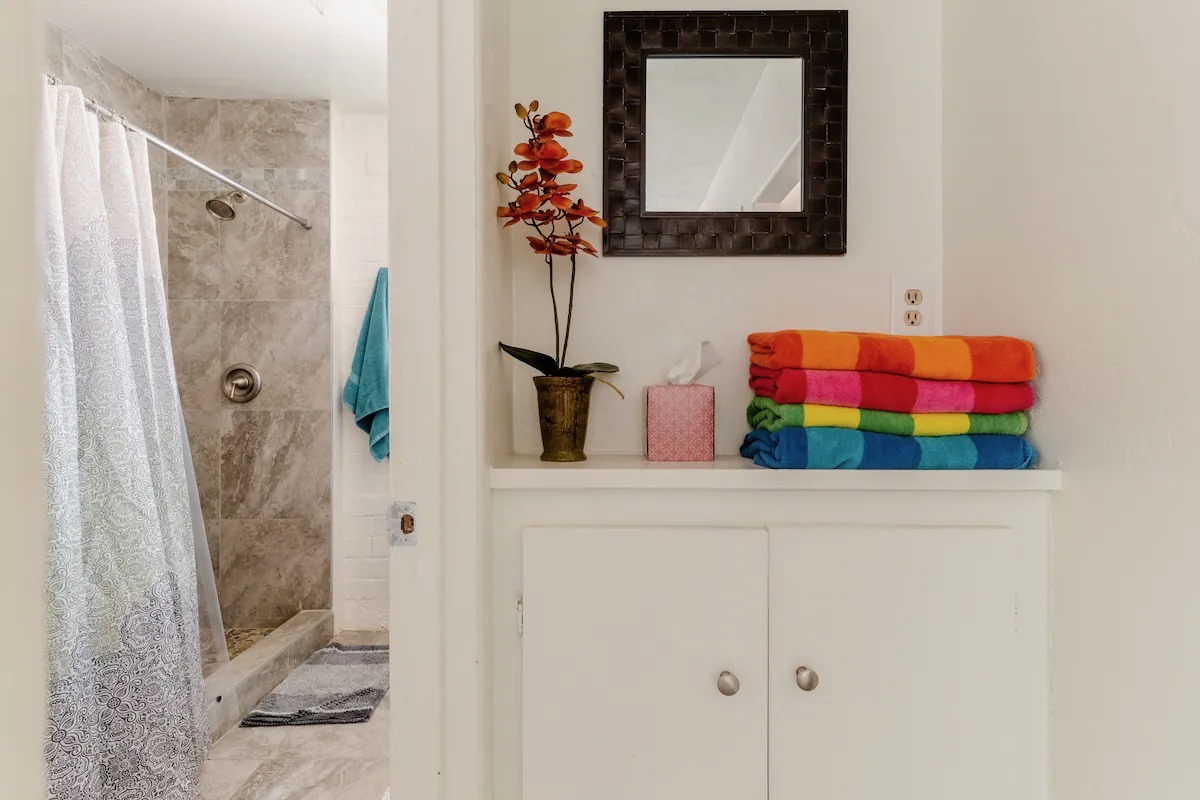 Bathroom: Walk-in shower (no tub), with beautiful gray & white high-end tile. The toilet and sink are spotless. Towels, toiletries, and a hair dryer are provided.