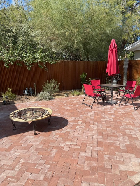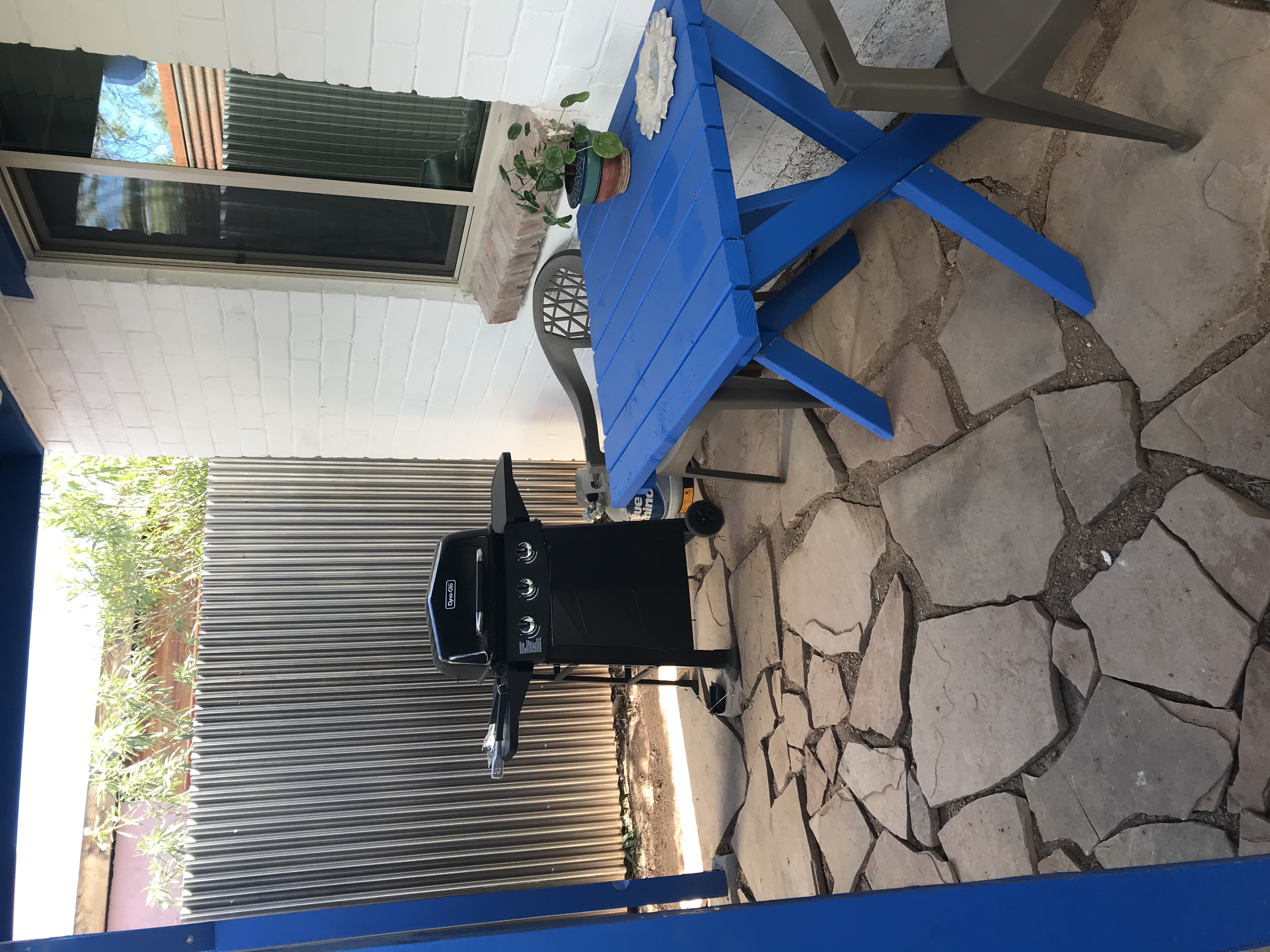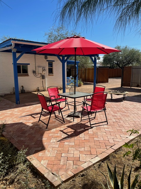 Outside: There is a small table out the back door next to the propane BBQ, and a large brick patio area with another table & umbrella that seats four people. There are several unique cacti and flowering plants, and you might spot a few cardinals if you are lucky. A fire pit is also available for evening fires. Wood is provided.
