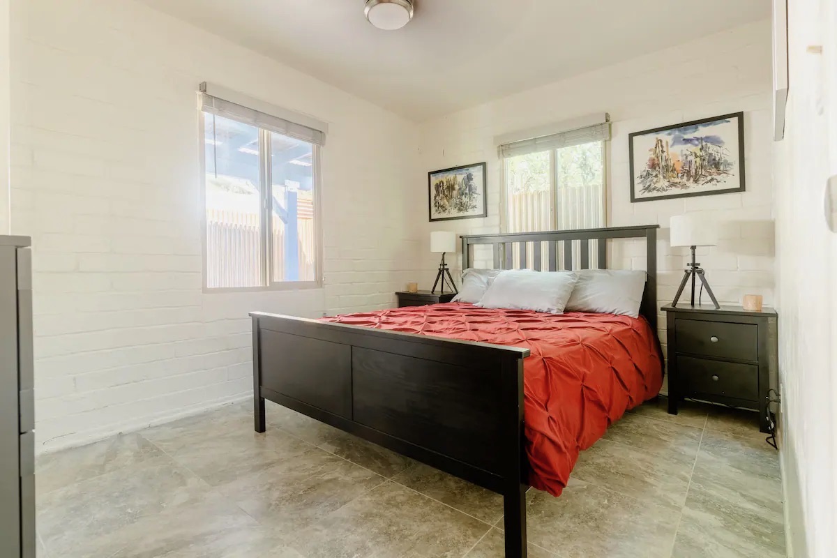 Bedroom: Comfortable queen bed with beautiful new linens, plenty of pillows (both foam and feather), closet, dresser, and a newly-installed second mini-split. Local southwest art adorns the walls.