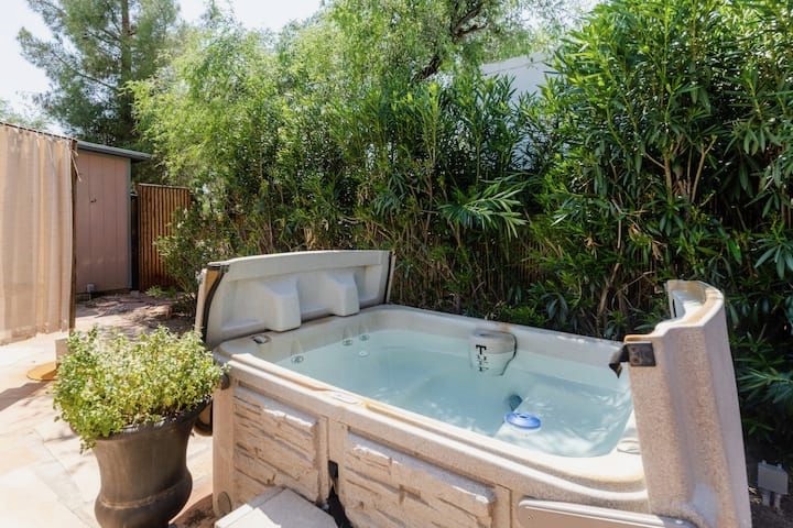 Hot Tub: A relaxing hot tub is available for use. Please note that the hot tub is on the property next door through a private gate. The hot tub is shared with other tenants who reside next door, but it is not shared with any of the other units on my property. The hot tub is drained and cleaned monthly, and set at 104 degrees.